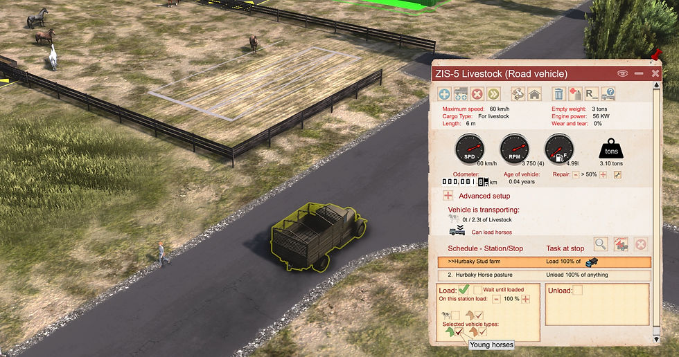 When it comes to horse-drawn vehicles, we decided to separate horses and carriages. Carriages are manufactured in carpenter workshops, where fabric, steel, and wood are delivered. The result is a finished carriage without horses. Horses are “produced” in the Stud Farm. Individual horses function as a type of resource. They behave similarly to regular vehicles, except they must be transported in special vehicles and stored in dedicated storage buildings—horse pastures.